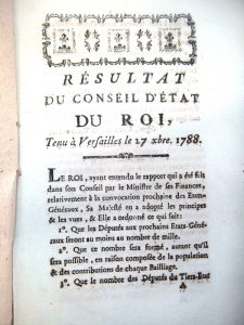 [VILLEDEUIL (Laurent)]. — Résultat du Conseil d'Etat du Roi, tenu à Versailles le 27 xbre 1788. — Sur l’imprimé de Paris, Imprimerie royale, 1788. — In-8, 32 p., br. ss couv. d’attente.