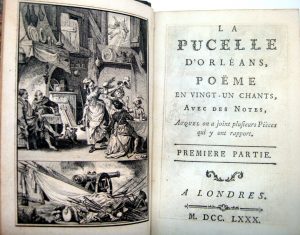 VOLTAIRE. — La Pucelle d’Orléans. — Londres, [Cazin], 1780. — 2 vol. in-18, 218 p., 180 p., veau aubergine à dos lisse orné dans le goût romantique, encadrement à filet doré sur les plats, tranches dorées, filets sur les coupes et...
