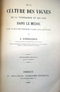 ARMAILHACQ (Armand d’). — De la culture des Vignes, de la vinification et les vins dans le Médoc, avec un état des vignobles d’après leur réputation. — Bordeaux, P. Chaumas, 1867. — In-8, xv, 616 p., 4 pl. h.t. — Broché.
