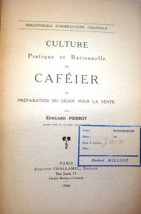 PIERROT (Édouard). — Culture pratique et rationnelle du caféier et préparation du grain pour la vente.— Paris, A. Challamel, 1906. — In-8, 92 p., [1] f. (table), bradel toile verte (rel. mod.).