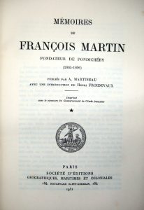 MARTIN (François).— Mémoires de François Martin fondateur de Pondichéry (1665-1696). — Paris, Société d’éditions géographiques, maritimes et coloniales, 1931-34. — 3 vol. fort in-8, xlii, 690 p. ; xxxii, 598 p. ; xxxii, 410 p., pl.,...