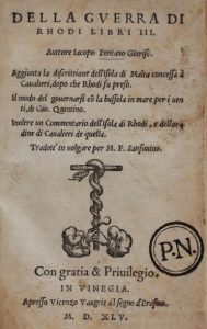 FONTANUS (Jacobus). Della guerra di Rhodi libri III. Aggiunta la discrittione dell'isola di Malta concessa à …