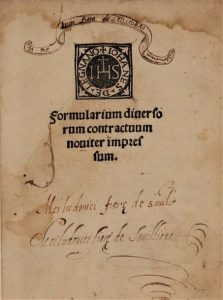 diversorum contractuum noviter impressum. Milan, Giovanni Angelo Scinzenzeler, 1502. In-4, bradel demi-vélin ivoire, tranches mouchetées (Reliure moderne). Rare édition milanaise de ce formulaire notarial, imprimée en caractères romains, avec la marque de Giovanni da Legnano sur le titre.
