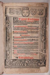Le Grant Coustumier du pays et duche de Normendie. Paris, François Regnault, 1534. 2 parties en un volume in-folio, basane brune, double encadrement de filets à froid avec fleurons d'angles dorés, médaillon à froid au centre, dos à quatre nerfs, tranches rouges (Reliure du XVIe siècle). Première édition, très rare et recherchée, du commentaire sur le coutumier de Normandie de Guillaume Le Rouillé (1494-1555), conseiller à l’échiquier d'Alençon.
