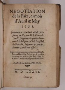 es mois d'avril & may 1575. Contenant la requeste & articles présentez au Roy par M. le Prince de Condé, seigneurs et gentilhommes de la Religion : M. le Mareschal de Danville, seigneurs et catholiques associez. S.l.n.n., 1576. In-8, vélin souple, traces d'attaches (Reliure de l'époque). Édition originale de ces négociations avec les Malcontents qui aboutiront à l'édit de Beaulieu, signé par Henri III le 6 mai 1576. Cet édit libéral reconnaît le culte protestant en lui accordant de nombreuses garanties.