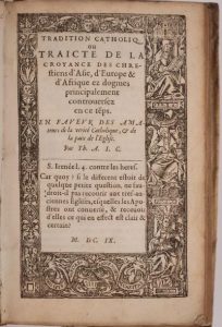 Tradition catholique ou Traicté de la croyance des chrestiens d'Asie, d'Europe & d'Afrique ez dogmes principalement controversez en ce temps, en faveur des amateurs de la vérité catholique et de la paix de l'Église, par Th. A. I. C. S.l.n.n., 1609. In-8, vélin souple (Reliure de l'époque). Ouvrage très rare sur les différences de dogme entre les Églises chrétiennes d'Orient, de Midi (éthiopienne), catholique romaine et réformées. Il a été publié en anglais la même année.