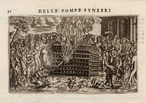 Pompei funebri di tutte le nationi del mondo. Vérone, Francesco Rossi, s.d. [1646]. In-8 oblong, cartonnage souple, non rogné (Reliure de l'époque). Seconde édition de ce rare ouvrage sur les rites funéraires des peuples antiques et modernes.
