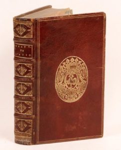 de David, traduit en françois : avec des Notes courtes, tirées de S. Augustin & des autres Pères. Neuvième édition. Paris, Élie Josset, 1698. In-8, maroquin rouge, triple filet doré, armoiries au centre, dos orné, roulette intérieure, tranches dorées sur marbrure (Reliure de l'époque). Texte sur trois colonnes, donnant en regard les notes des Pères de l'Église, abrégées et traduites en français, puis le texte latin de la Vulgate et enfin sa traduction en français.