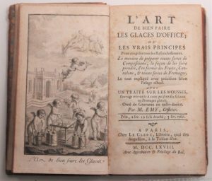 L'Art de bien faire les glaces d'office ; ou les vrais principes pour congeler tous les rafraîchissemens. La manière de préparer toutes sortes de compositions, la façon de les faire prendre, d'en former des fruits, cannelons, et toutes sortes de fromages. Avec un traité sur les mousses. Paris, Le Clerc, 1768. In-12, basane marbrée, dos orné, tranches rouges (Reliure de l'époque). Édition originale du premier livre consacré exclusivement aux glaces et sorbets, dont près de 150 recettes sont évoquées, ainsi qu'aux mousses à base de crème fouettée. La technique de coloration est expliquée.