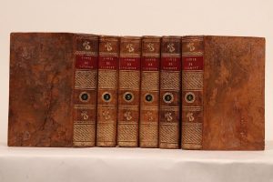 Le Comte de Valmont, ou les égaremens de la raison. Paris, Moutard, 1774-1778. – La Théorie du bonheur. Faisant suite au Comte de Valmont. Paris, Bossange, Masson et Besson, 1807. 6 volumes in-12, basane racinée, dos lisse orné, tranches marbrées (Reliure de l'époque). Édition originale de ce roman édifiant qui constitue une source importante des Liaisons dangereuses.
