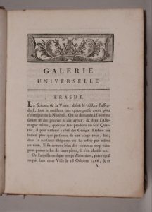 [Galerie universelle des hommes qui se sont illustrés dans l'empire des lettres..., des grands ministres et hommes d'État les plus distingués]. S.l.n.d. [Paris, l'auteur, 1787-1789]. 23 livraisons en 2 volumes in-4, cartonnage de papier ocre, pièces de titre rouge et de tomaison verte, tranches jaspées (Reliure de l'époque). Ce recueil biographique se présente en deux volumes titrés respectivement Héros et Auteurs, qui rassemblent les livraisons de la Galerie universelle consacrées au comte Lally de Tolendal, Henri II de Montmorency, Henri de Rohan, Crillon, Catinat, maréchal de Vieilleville, comte de Saxe, Bourdillon, maréchal de Fabert, maréchal de Noailles, Grand Condé, Bayard, dans le volume des Héros, et à Érasme, L'Arétin, Pope, Young, Newton, Descartes, Montaigne, Montesquieu, Molière, Corneille et Voltaire, dans le volume des Auteurs.