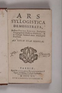 Ars syllogistica demonstrata, ad usum suæ scholæ. Tarbes, Matthieu Roquemaurel, 1712. In-12, basane racinée, tranches teintées (Reliure de l'époque). Une des premières impressions de Tarbes, donnée par le premier imprimeur de la ville, Roquemaurel.