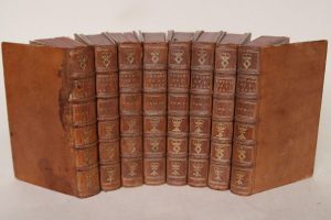 Voyages en Espagne et en Italie. Paris, J.-B. et Charles Delespine, 1730. 8 volumes in-12, veau fauve, dos orné de pièces d'armes alternées, tranches rouges (Reliure de l'époque). Édition originale de cette relation de voyages effectués entre 1705 et 1716 en Espagne (Cadix et Séville) et en Italie (Gênes, Bologne, Tivoli, Cicita-Vecchia, Naples, San Marino, etc.).