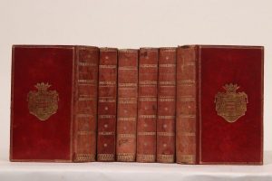 Œuvres. Nouvelle édition, augmentée de l'Anti-Machiavel, & autres pièces. La Haye, la Compagnie, 1743. 6 volumes in-12, maroquin rouge, filets droits et pointillés, armoiries au centre, dos lisse orné, dentelle intérieure, tranches dorées (Reliure de la fin du XVIIIe siècle). Nouvelle édition de cette traduction, publiée entre 1691 et 1696 par François Tétard.