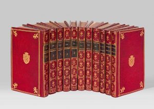 Collection des moralistes anciens, dédiée au Roi. Paris, Didot l'aîné, De Bure l'aîné, 1782-1783. Ensemble 11 volumes in-18, maroquin rouge, triple filet doré avec lions héraldiques aux angles, armoiries au centre, dos lisse orné de fleurons dorés, pièce de titre verte, tranches dorées (Reliure de l'époque). Réunion des titres suivants : Morale de Sénèque (3 vol.). – Caractères de Théophraste et pensées morales de Ménandre (1 vol.). – Pensées morales d'Isocrate (1 vol.). – Pensées morales de Confucius (1 vol.). – Pensées morales de divers auteurs chinois (1 vol.). – Pensées morales de Cicéron (1vol.). – Les Entretiens mémorables de Socrate (2 vol.). – Sentences de Théognis, de Phocylide, de Pythagore, et des sages de la Grèce (1 vol.).
