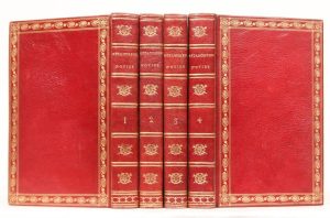 Les Métamorphoses, traduites par J. G. Dubois-Fontanelle. Paris, L. Duprat, Letellier & Cie, 1802. 4 volumes in-8, maroquin rouge, bordure de palmettes dorées, dos orné, grecque intérieure dorée, tranches dorées (Reliure de l'époque). Nouvelle édition de cette traduction donnée en 1767, revue, corrigée et augmentée de notes par l'auteur, avec le texte latin.