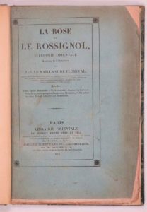 La Rose et le rossignol, allégorie orientale. Paris, Dondey-Dupré, J. Albert Merklein, 1833. In-8, bradel demi-percaline bleue, dos lisse orné d'un fleuron doré, non rogné, couverture (Reliure du début du XXe siècle). Première édition séparée de la traduction française, par Paul-Émile Le Vaillant de Florival (1799-1862). Le texte arménien et sa traduction avaient paru ensemble, en 1832, dans une édition autographiée.