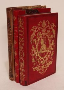 Ensemble 3 ouvrages. PRÉVOST (Abbé). Histoire de Manon Lescaut et du chevalier Des Grieux. Paris, Bourdin, s.d. [1839]. Grand in-8, chagrin rouge, listel à froid, grande plaque dorée représentant Manon Lescaut sur le plat supérieur et Des Grieux sur le plat inférieur, dos lisse orné de même, tranches dorées (Boutigny). Édition illustrée par Tony Johannot d'un frontispice, de 18 planches hors texte sur chine collé et de nombreuses vignettes. De la bibliothèque du Dr Requin, avec ex-libris. Coiffe de queue abîmée, 2 ajouts manuscrits p. v.