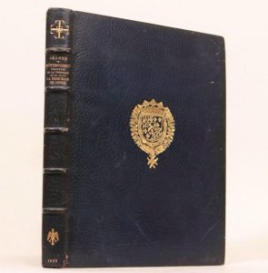 Inventaire de François de La Trémoille, 1542, et comptes d'Anne de Laval. Nantes, Émile Grimaud, 1887. – Jeanne de Montmorency, duchesse de La Trémoille, et sa fille la princesse de Condé. 1573-1629. Ibid., 1895. – Une succession en Anjou au XVe siècle. Ibid., 1898. – Mon grand-père à la cour de Louis XV et à celle de Louis XVI. Nouvelles à la main. Paris, Honoré Champion, 1904. Ensemble 4 volumes in-4, maroquin bleu nuit, armoiries au centre, dos orné de deux emblèmes dorés, tête dorée, non rogné, couverture (Yseux). Éditions originales, imprimées à petit nombre sur hollande.