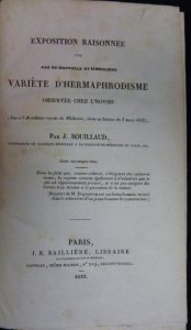 BOUILLAUD. Exposition raisonnée d'un cas de nouvelle et singulière variété d'hermaphrodisme observée chez l'homme. Paris & Londres, Baillère, 1833. Édition originale, illustrée de 4 figures montrant les organes génitaux hermaphrodites lithographiées en noir sur une grande planche dépliante. Courte déchirure sur la planche, dernier feuillet relié par erreur après le titre de l'ouvrage.
