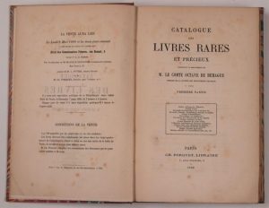 Catalogue des livres, des manuscrits et des autographes composant la bibliothèque de feu M. Édouard Fournier. Paris, Labitte, 1880. – Catalogue d'un choix de livres rares et précieux manuscrits et imprimés composant le cabinet de feu M. le marquis de Ganay. Paris, Porquet, 1881. 2 ouvrages en un volume in-8, bradel percaline rose (Pierson).