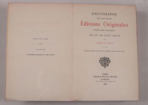 Bibliographie des principales éditions originales d’écrivains français du XVe au XVIIIe siècle. Paris, Georges Jeanne et H. Brulon, 1927. In-4, broché. Réimpression de l'édition de 1888.