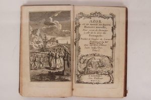 Azor ou le prince enchanté ; histoire nouvelle, pour servir de chronique à celle de la terre des perroquets. Londres [Paris], Vaillant, 1750. 2 tomes en un volume in-12, veau marbré, supralibris doré sur le plat supérieur, dos lisse orné, tranches rouges (Reliure de l'époque). Édition originale peu commune de ce voyage imaginaire, ornée d'un frontispice et d'un titre gravé répété.
