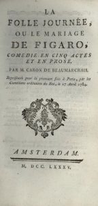 La Folle journée, ou le Mariage de Figaro, comédie en cinq actes, en prose. Amsterdam, s.n., 1785. In-8, broché, couverture d'attente de papier bleu, titre manuscrit, non rogné. Édition parue la même année que l'originale.