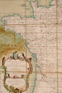 Nouvelle carte qui comprend les principaux triangles qui servent de fondement à la Description géométrique de la France. [Paris, Delisle], 1744. Carte gravée sur cuivre (60 x 93 cm), entoilée. Première carte de triangulation de la France, gravée par Dheulland d'après les relevés de Maraldi et Cassini et accompagnée des latitudes et longitudes des principales villes françaises.