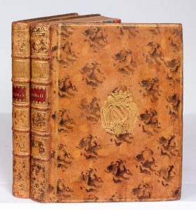 Œuvres. Paris, Imprimerie royale, 1750. 2 volumes in-4, veau marbré, triple filet doré, armoiries au centre, dos orné, tranches dorées (Reliure de l'époque). Première édition collective, ornée d'une vignette sur le titre de chaque tome, d'un en-tête et d'une lettrine dessinés par Boucher gravés sur cuivre par Le Bas.