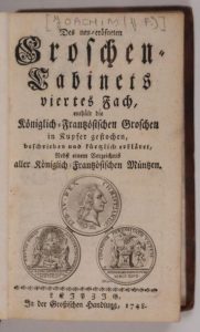 Des neu-eröfneten Groschen-Cabinets viertes Fach, enthält die Königlich-Frantzösischen Groschen in Kupfer gestochen. Leipzig, Grosse, 1748. In-8, basane brune, filets à froid, étiquette de titre postérieure, tranches mouchetées (Reliure de l'époque). Quatrième partie de cet ouvrage de numismatique, consacrée aux monnaies royales françaises. Elle renferme 6 tableaux et 17 planches gravées repliés.
