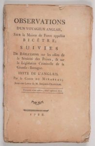 Observations d'un voyageur anglais, sur la maison de force appellée Bicêtre. Suivies de réflexions sur la sévérité des peines, & sur la législation criminelle de la Grande-Bretagne. 1788. In-8, dérelié, non rogné. Édition originale de ce violent pamphlet de Mirabeau, suivi d'une lettre de Benjamin Franklin sur le même sujet.