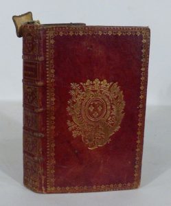 de la quinzaine de Pasque, latin-françois, à l'usage de Rome et de Paris, pour la maison de Monseigneur le Duc d'Orléans. Paris, d'Houry, 1747. In-8, maroquin rouge, dentelle dorée, armoiries au centre, dos orné d'armoiries répétées, dentelle intérieure dorée, tranches dorées, liseuse en soie brodée (Reliure de l'époque). Frontispice dessiné et gravé à l'eau-forte par Jacques Dumont, dit le Romain.