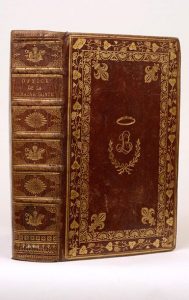 de la Semaine Sainte. Paris, Garnier, 1752. In-8, maroquin rouge, frises de pampre et de palmettes dorées, fleurs de lis dorées aux angles, chiffre LB dans une couronne de laurier et surmonté d'une auréole étoilée dorés, dos orné d'atributs religieux et de triangles rayonnants alternés, doublure et gardes de papier coloré doré, tranches dorées (Reliure du XIXe siècle). Bel exemplaire dans une jolie reliure en maroquin rouge richement décorée.