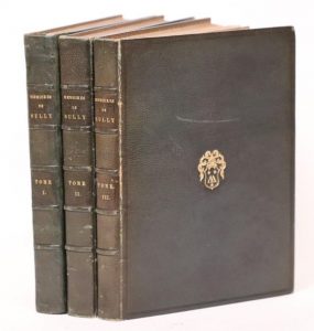 Mémoires. Londres, s.n., 1745. 3 volumes in-4, maroquin bleu nuit, double filet à froid, chiffre armorié doré au centre, dentelle intérieure, tranches dorées (Koehler). Une des plus belles éditions des mémoires de Sully, ornée de 57 portraits gravés dans de beaux encadrements rocaille.
