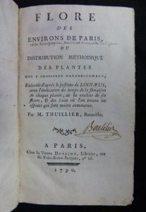 Flore des environs de Paris, ou distribution méthodique des plantes qui y croissent naturellement. Paris, veuve Desaint, 1790. — JÖRLIN (Engelbert). Principia botanices illustrata, seu partes fructificationis, characteribus, terminis technicis, figuris illustratæ. Lund, J. Lundblad, 1786. 2 ouvrages en un volume in-12, demi-basane brune avec coins de vélin, dos lisse, tranches rouges (Reliure de l'époque). Édition originale de la flore de l'Île-de-France de Thuillier, organisée d'après la classification botanique de Linné.