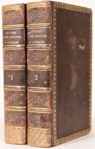Lettres à une princesse d'Allemagne sur divers sujets de physique et de philosophie. Paris, Mme Vve Courcier et Bachelier, 1812. 2 volumes in-8, veau, roulettes sur les plats, dos orné (Reliure de l'époque). Nouvelle édition revue et augmentée, illustrée d'un portrait-frontispice en tête du tome I et de 6 planches dépliantes in fine.
