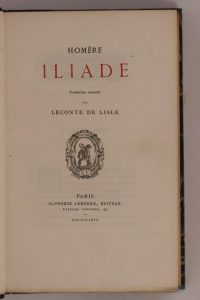 Illiade. Paris, Alphonse Lemerre, 1867. – Odyssée. Hymnes. Épigrammes. Batrakhomyomakhie. Ibid., 1868. 2 volumes grand in-8, demi-chagrin bleu nuit, tête dorée, non rogné, couverture (Paul Vié). Éditions originales des traductions de Leconte de Lisle.