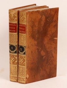 On joint : BLAIR (Hugh). Cours de rhétorique et de belles-lettres. Paris, Delalain, 1821. 2 volumes in-8, basane racinée, dos lisse orné, tranches marbrées (Reliure de l'époque). Seconde édition augmentée de la traduction de Pierre Prévost. Livre de prix du collège d'Angoulême décerné à Jules de Bastide en 1823. Épidermure sur un plat.