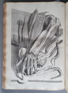 Govert Bidloo (1649-1713), physicien et anatomiste hollandais, fut l'élève de Frédéric Ruysch et devint professeur d'anatomie à La Haye et à Leyde. Son traité d'anatomie est le plus beau de la période baroque, magnifié par des gravures artistiques et spectaculaires finement gravées d'après des dessins de Gérard de Lairesse (1640-1711), grand peintre flamand de son temps.