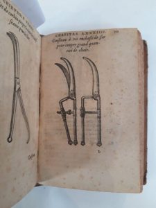 Le texte est agrémenté de nombreuses illustrations gravées sur bois reprises d'Ambroise Paré et de Vidius, représentant des instruments de chirurgie (cousteau à vis enchassé de fer pour couper grand quantité de chair, bec de corbin, pelicans & daviets pour rompre et arracher les dents, sondes, tenailles, etc.) et des techniques pour réparer les fractures.