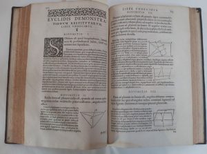 Elementa, libris XV. Paris, Jacques du Puys, 1578 [au colophon] : Lyon, Ex Officina Joannis Tornaesii Typographi Regia, 1578. In-folio, veau granité, dos orné, pièce de titre rouge, tranches mouchetées de rouge (Reliure vers 1700).