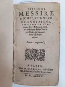 Essais. Reveus & augmentez. Paris, Jean Richer, 1587. In-12, vélin souple (Reliure de l'époque).