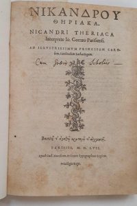 Première édition complète de la traduction et des commentaires du médecin Jean de Gorris (1505-1577) sur les Thériaques et Alexipharmaques de Nicandre, poète et médecin grec du IIe siècle avant J.-C., deux poèmes traitant de toxicologie, principalement des venins, des poisons et des antidotes. Cette version latine est très réputée. Chaque partie possède un titre séparé.