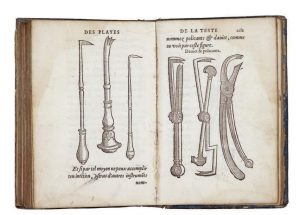 Méthode curative des playes et fractures de la Teste humaine avec les portraits des instruments. Paris, De l'Imprimerie de Jehan Le Royer, 1561. In-8, vélin rigide tacheté de brun, tranches jaspées (Reliure du début du XVIIe siècle).