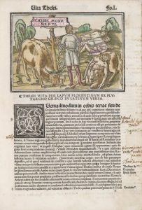 Exemplaire comportant plusieurs annotations à la plume (la plupart coupées par le couteau du relieur) et dont 4 des bois ont été anciennement coloriés.