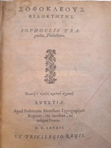 SOPHOCLE. Philoctetes [graecae et latinae]. Paris, Fédéric Morel, 1586. 2 parties en un volume in-4, …