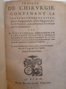 Traicté de chirurgie, contenant la vraye methode de guerir playes d'arquebusade, selon Hippocras, Galen [sic] & Paracelse. Lyon, Pour Berthelemy Vincent [sic], 1581. In-8, veau brun, filet à froid, dos à nerfs soulignés de filets à froid se prolongeant sur les plats (Reliure moderne).