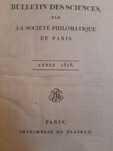 «Mémoire sur la température des habitations et sur le mouvement varié de la chaleur dans les prismes rectangulaires» (pp. 1-11) et «Note relative aux vibrations des surfaces élastiques et au mouvement des ondes» (pp. 129-136). In : BULLETIN DES SCIENCES, par la société philomatique de Paris, année 1818. Paris, Imprimerie de Plassan, 1818. In-4, basane marbrée (Reliure de l'époque).