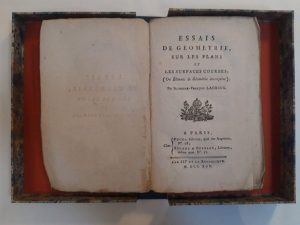 Essais de géométrie, sur les plans et les surfaces courbes ; (ou Éléments de Géométrie descriptive). Paris, Fuchs, Régent et Bernard, L'An IIIe de la République, 1795. In-8, broché, non rogné, couverture parme muette, boîte moderne.